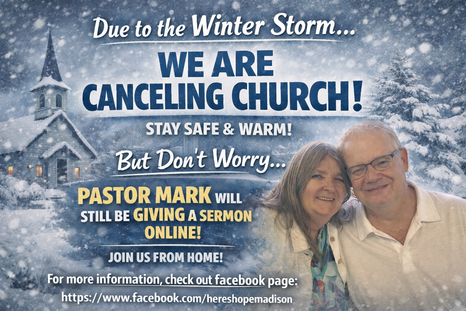 Due to the weather, Pastor Mark has decided to cancel the service for tomorrow. We will post a link to the sermon on the Facebook and YouTube pages. https://www.facebook.com/hereshopemadison https://www.youtube.com/@HeresHopeChurch